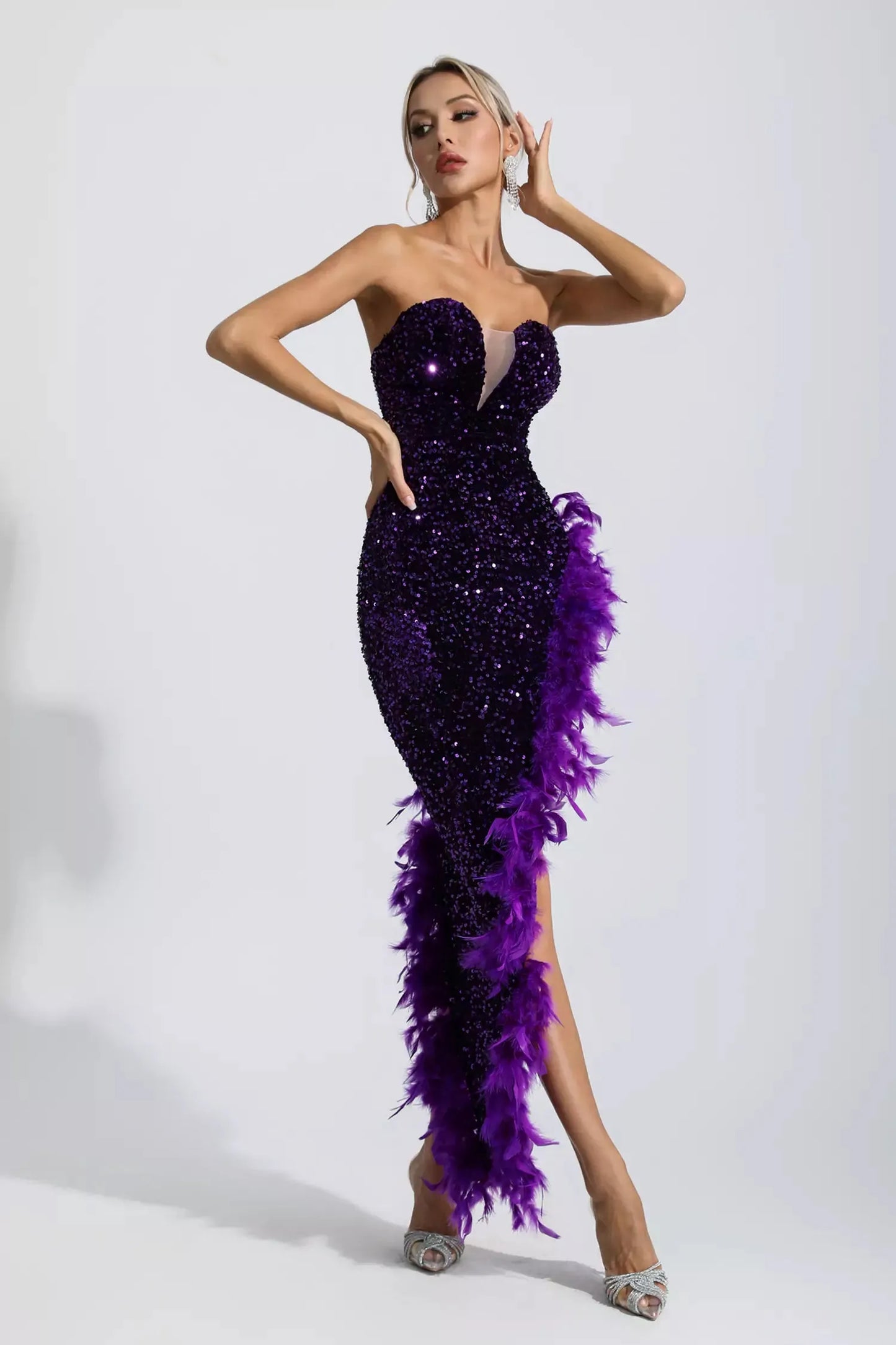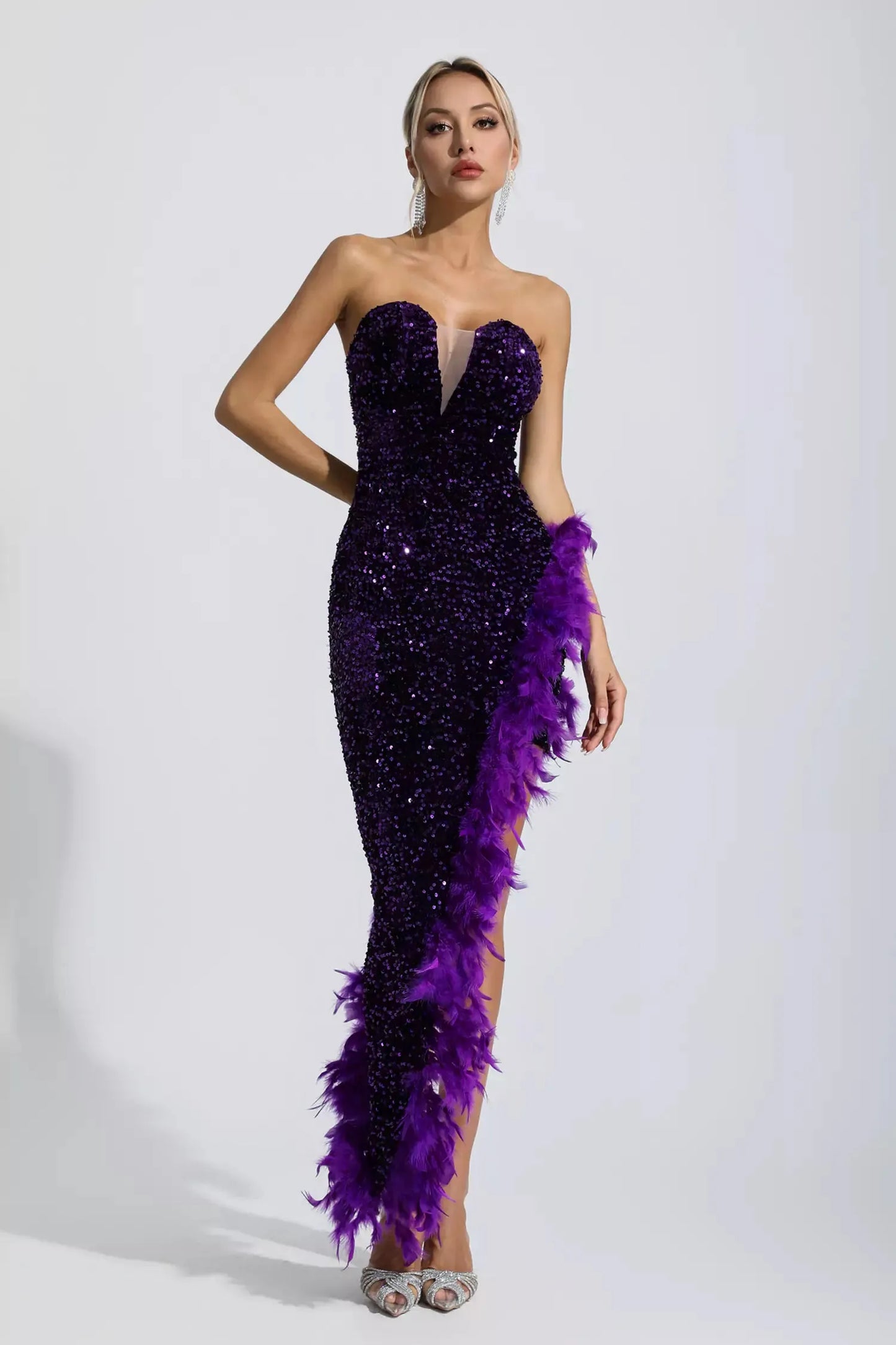 Tiana Siyah Tek Omuz Tüy Bandaj Maxi Elbise