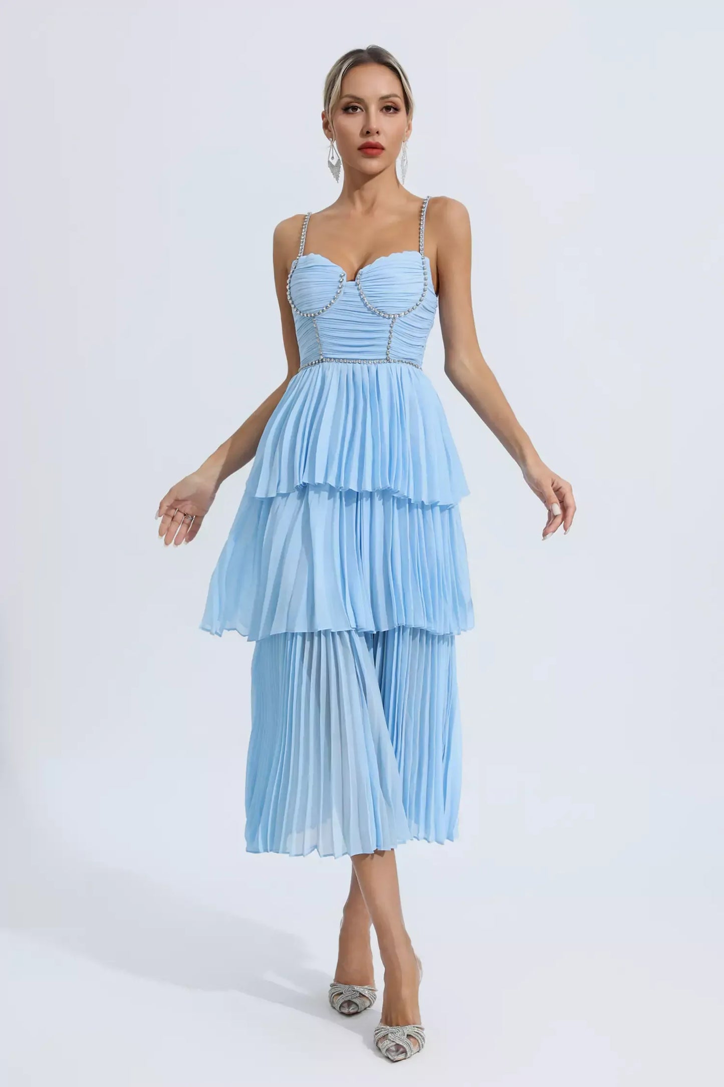 Meredith Mavi Pırlanta Dantelli Midi Elbise