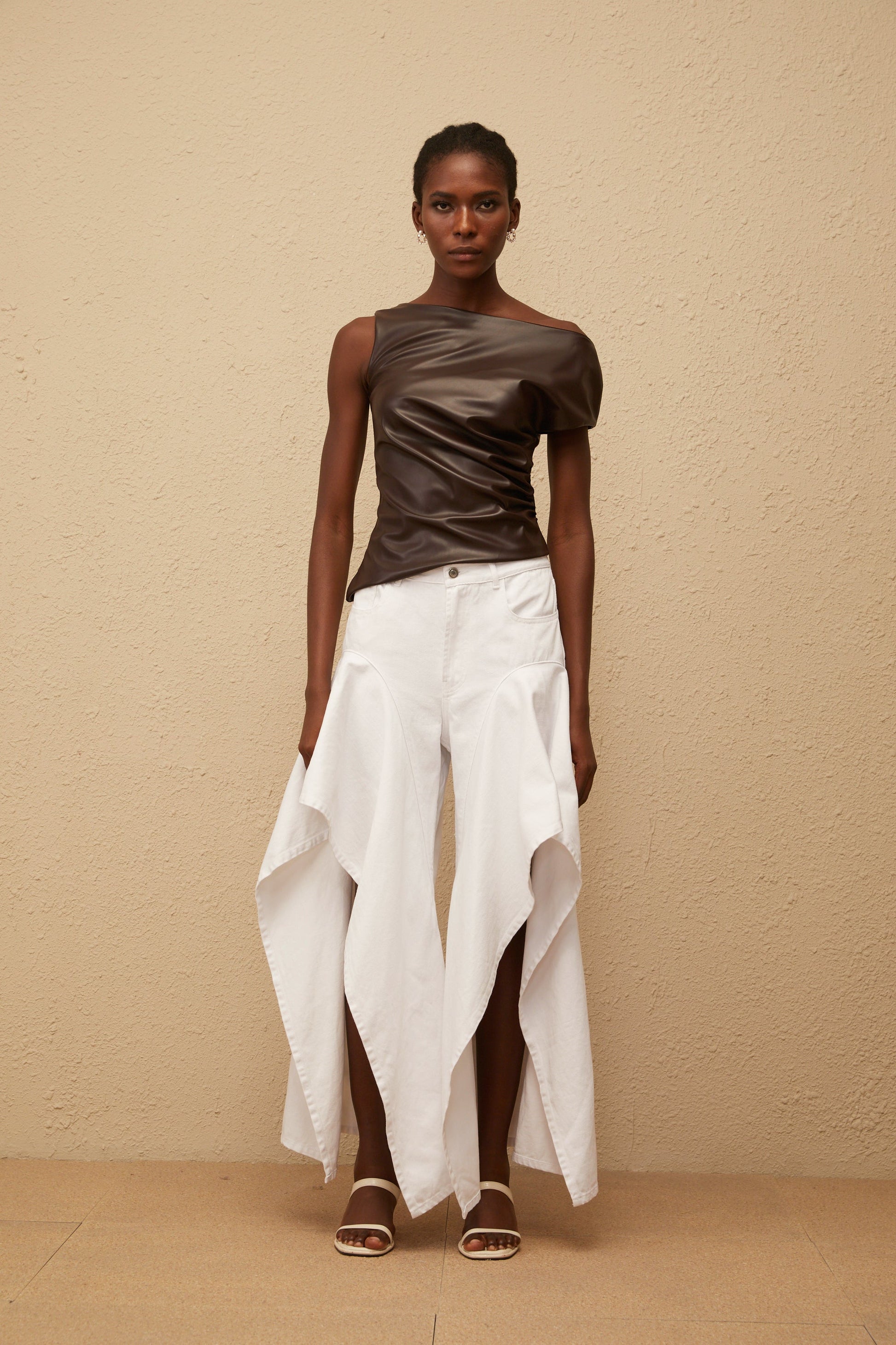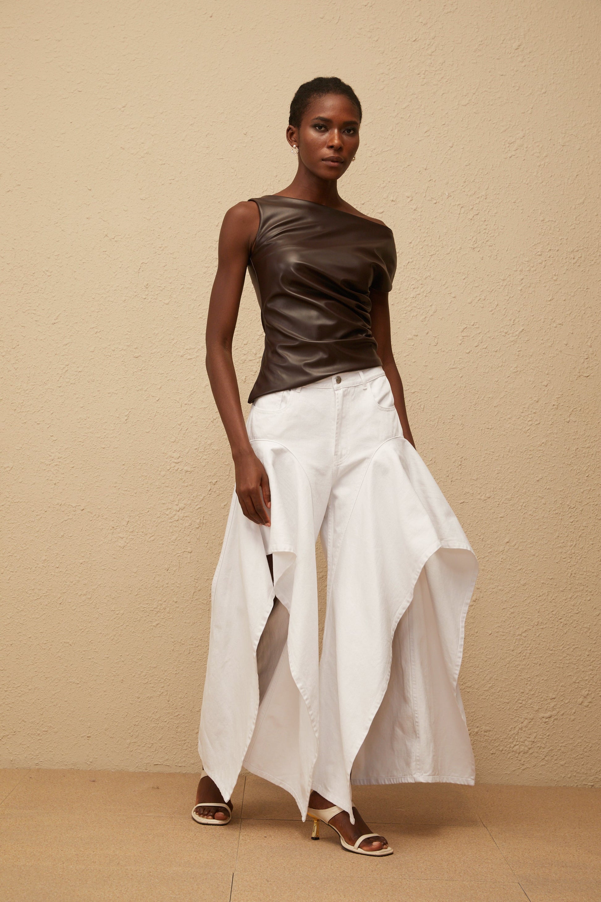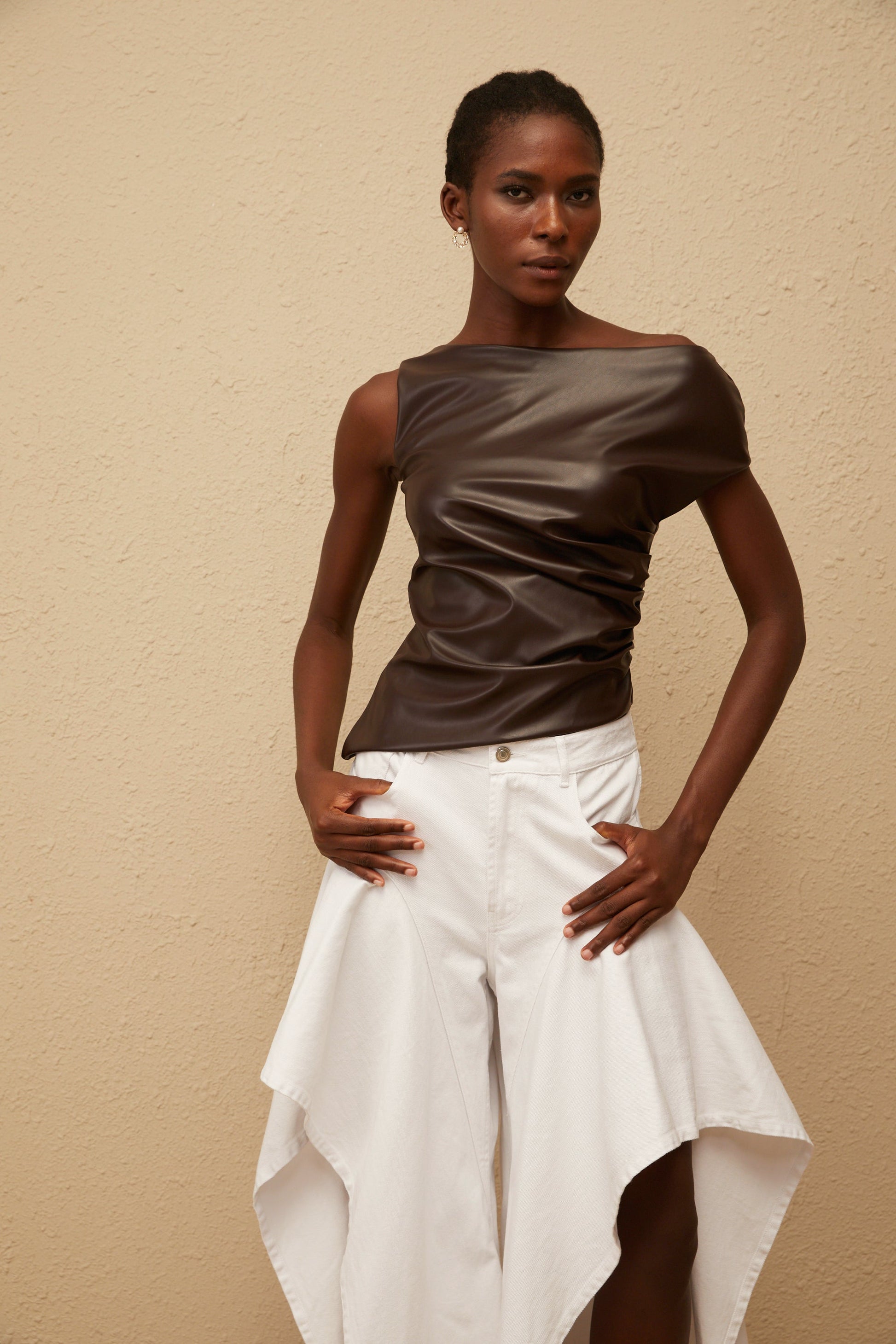 Bu şık deri üst, zarif detayları ve asimetrik tasarımıyla göz alıcı bir seçenek.