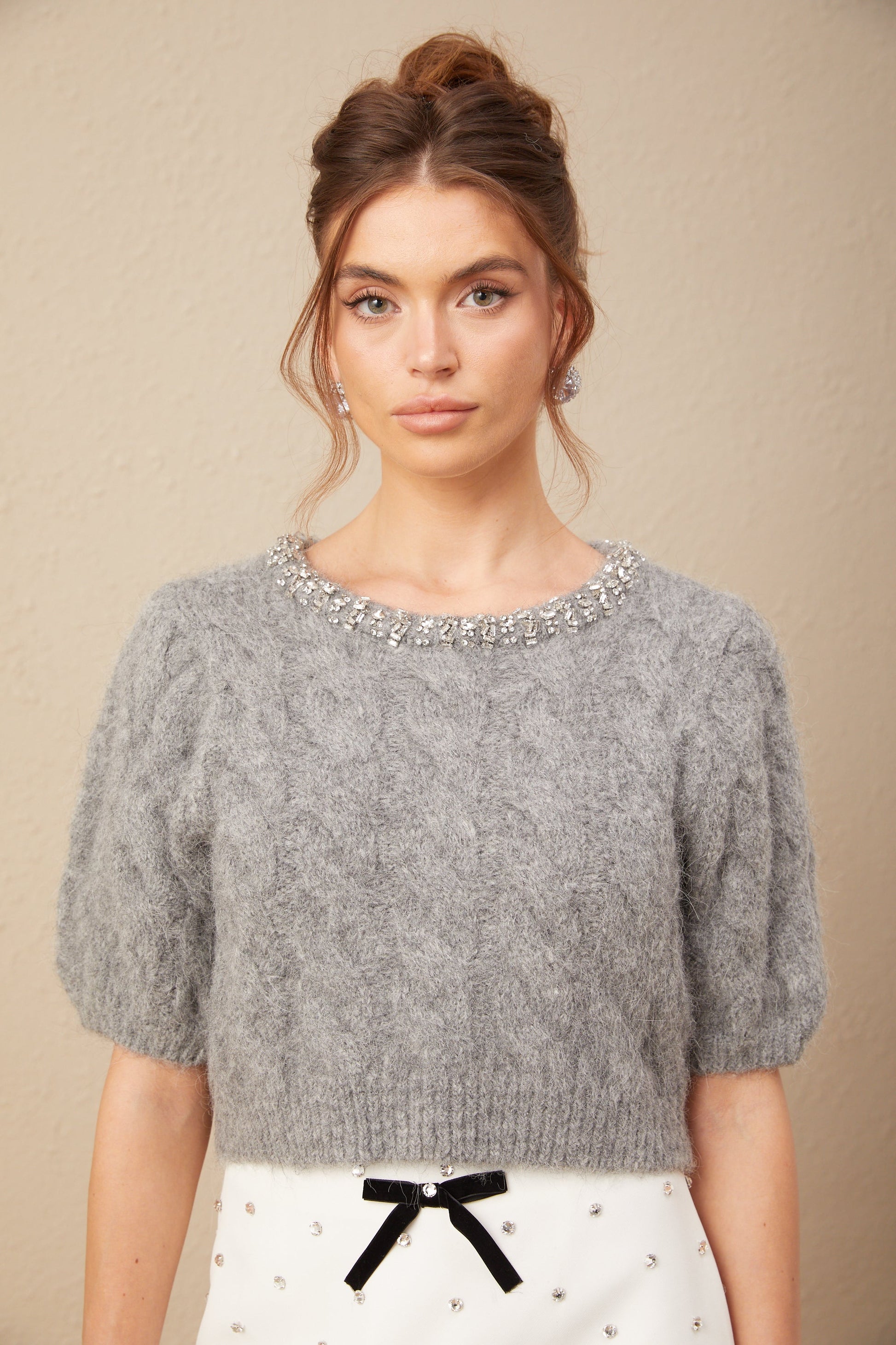 Ophélie Süslenmiş Kablo Örgülü Kısa Tiftik Kazak