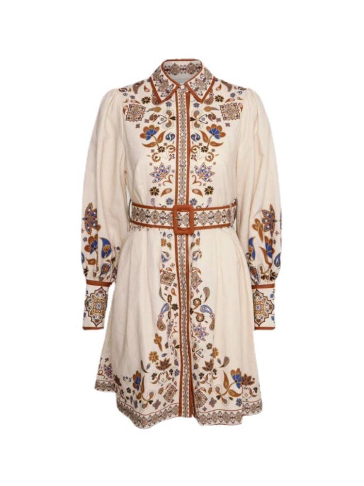 İncili Baskılı Kuşaklı Mini Gömlek Elbise