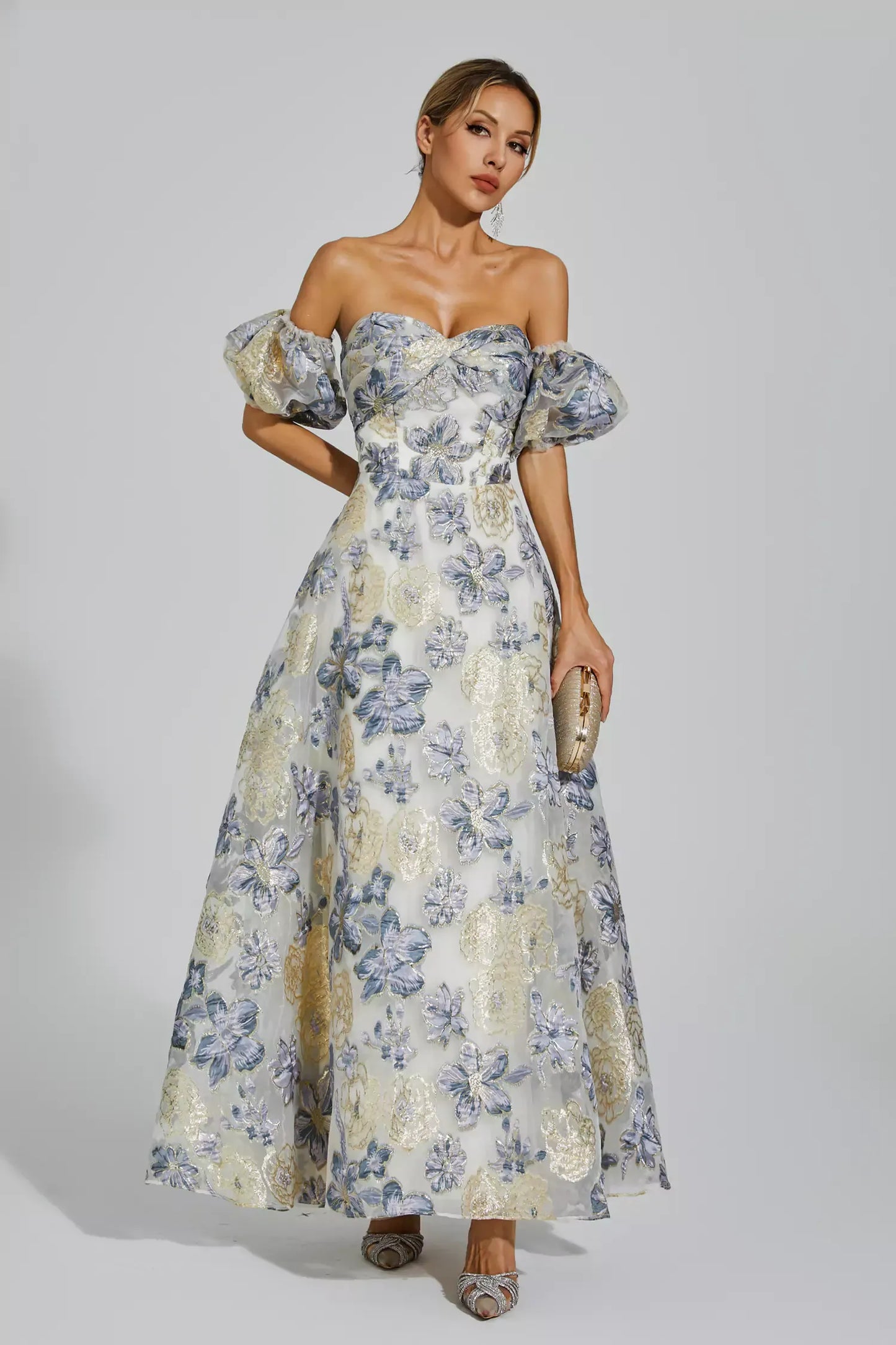 Reem Mavi Çiçek Düşük Omuz Uzun Elbise