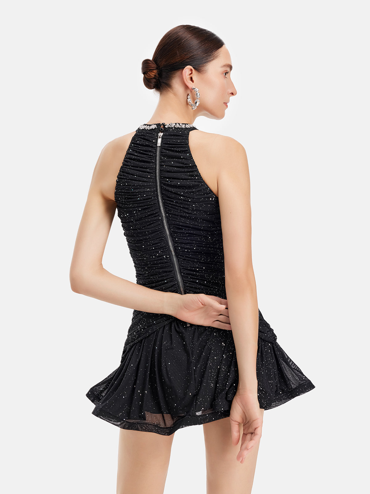 Taşlı Boyundan Bağlamalı Pileli Mini Elbise