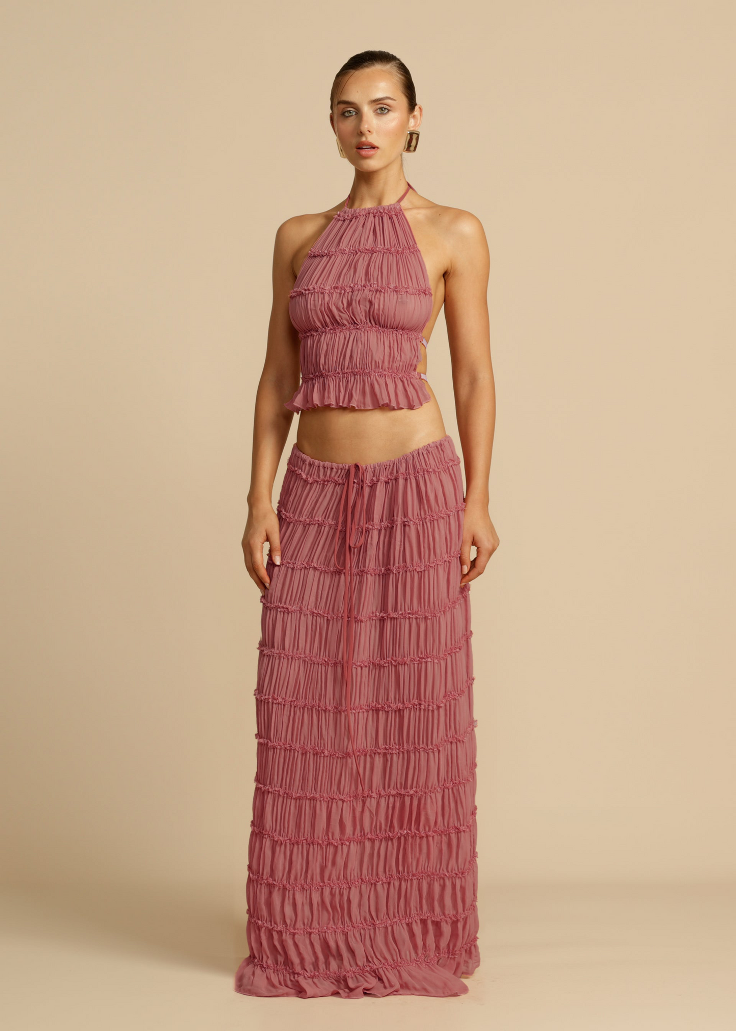 Yvonne Diamante Tüylü Pileli Maxi Şifon Elbise