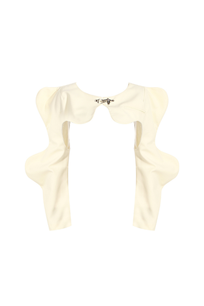 -Detaylar:Uzun kollu, düğme kapama, gümüş klips detay, asimetrik kollar, çıkarılabilir pelerin kısım, kolsuz kısa gömlek gövde
