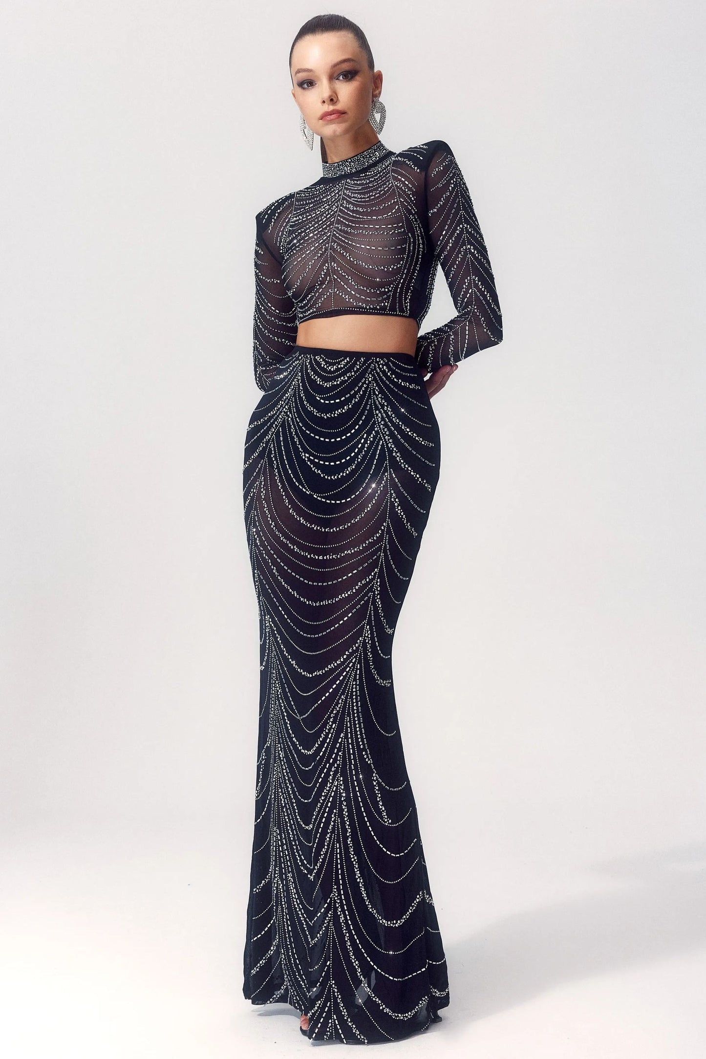Biberiye Siyah 3D Çiçekli Uzun Elbise