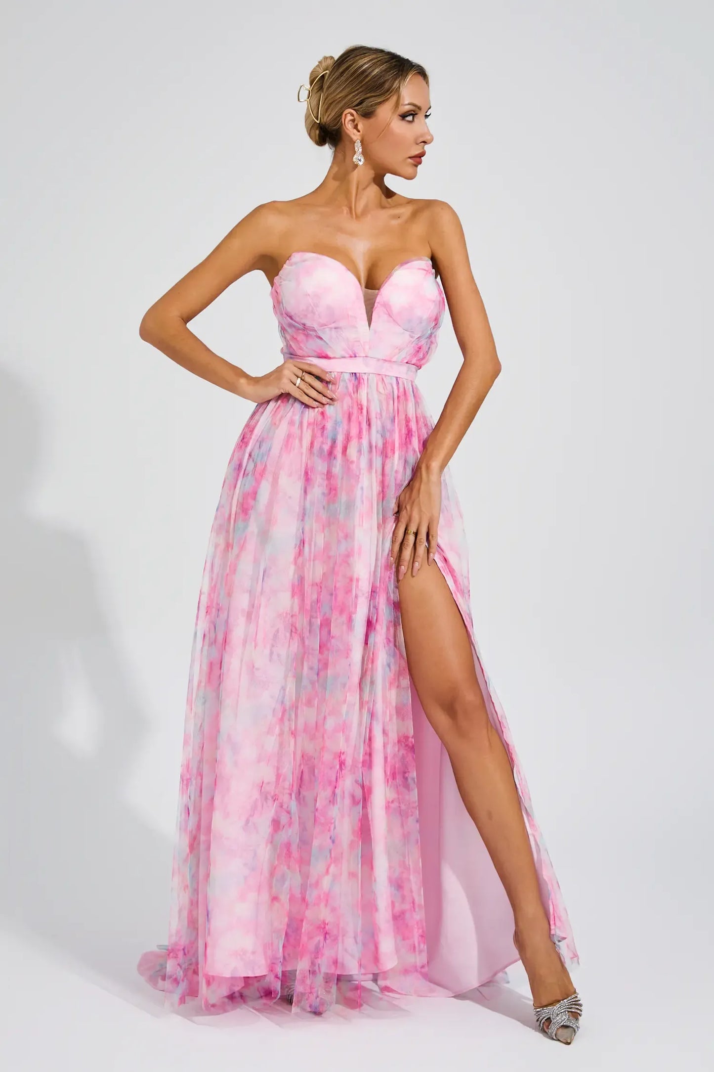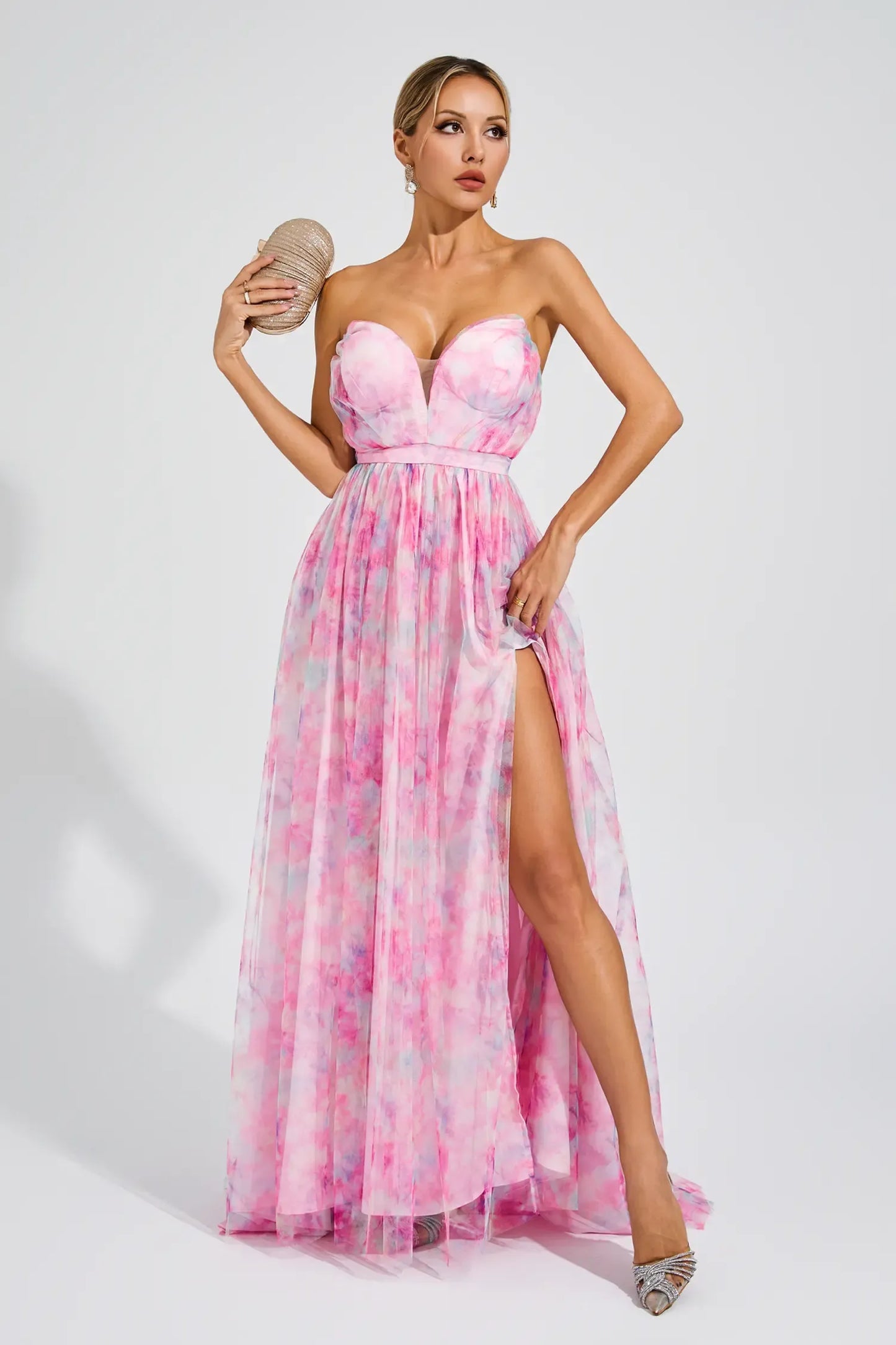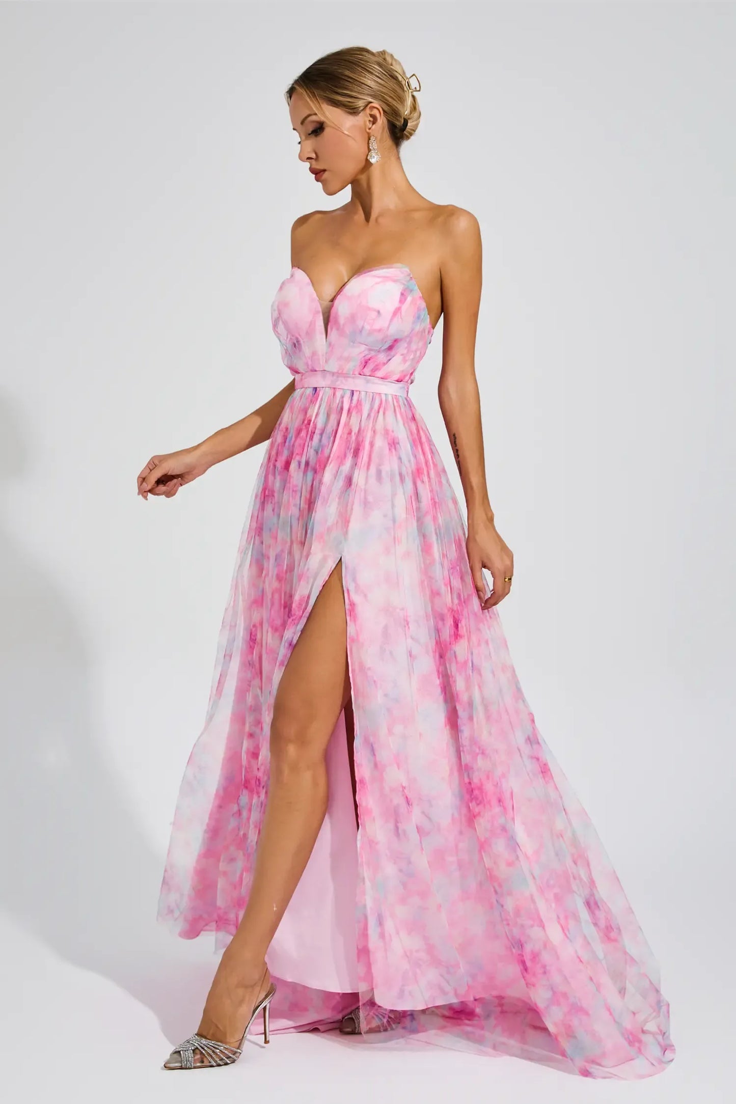 Sheila Pembe Çiçekli Yırtmaçlı Omuz Uzun Elbise