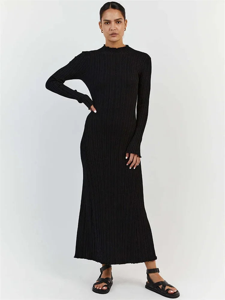 Uzun Kollu Triko Nervürlü Maxi Elbise