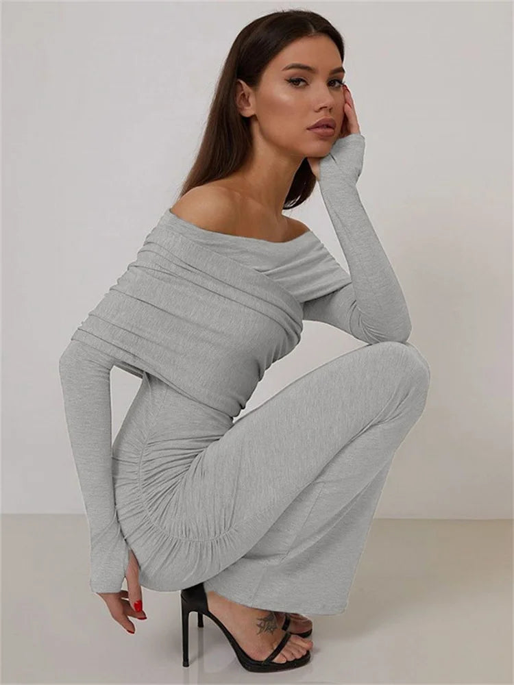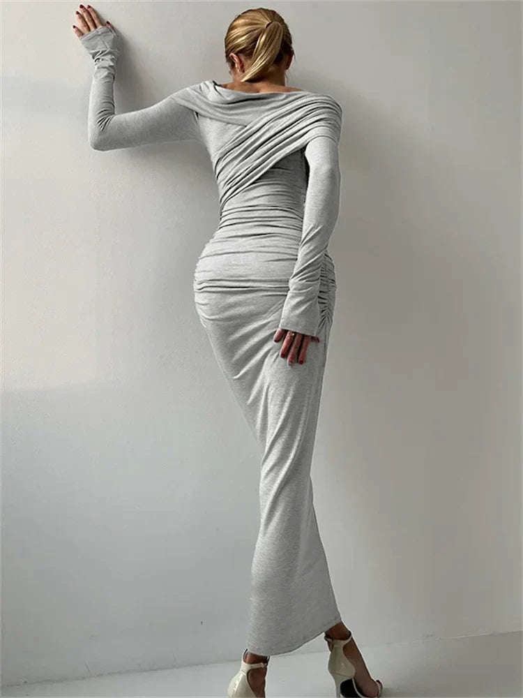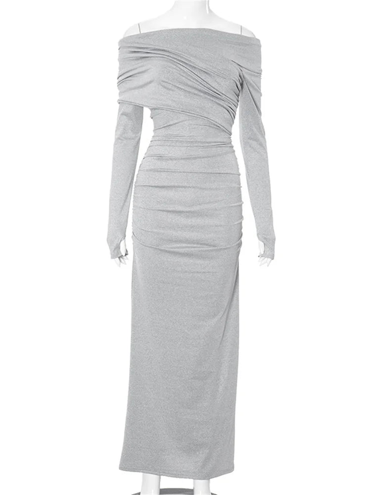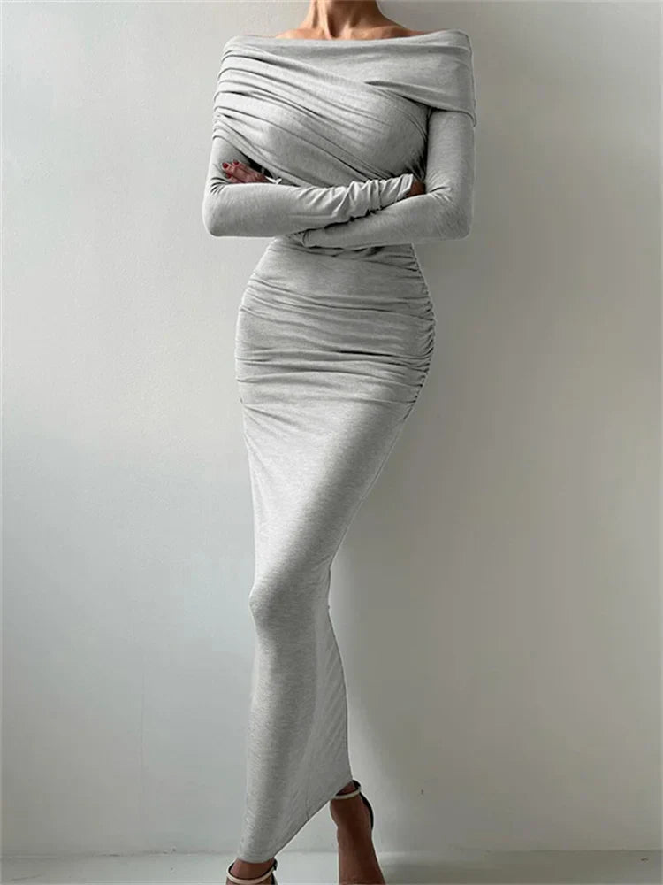 Kayık Yaka Yanları Büzgü Dikişli Maxi Elbise