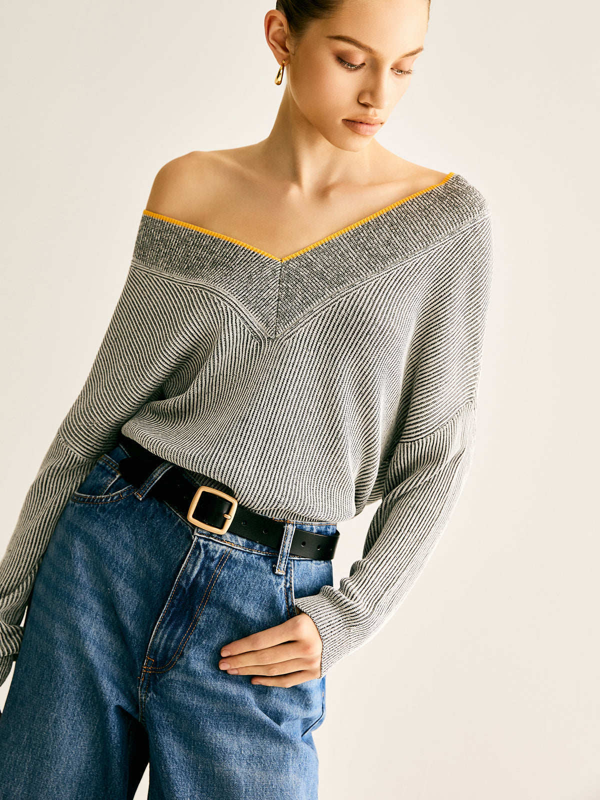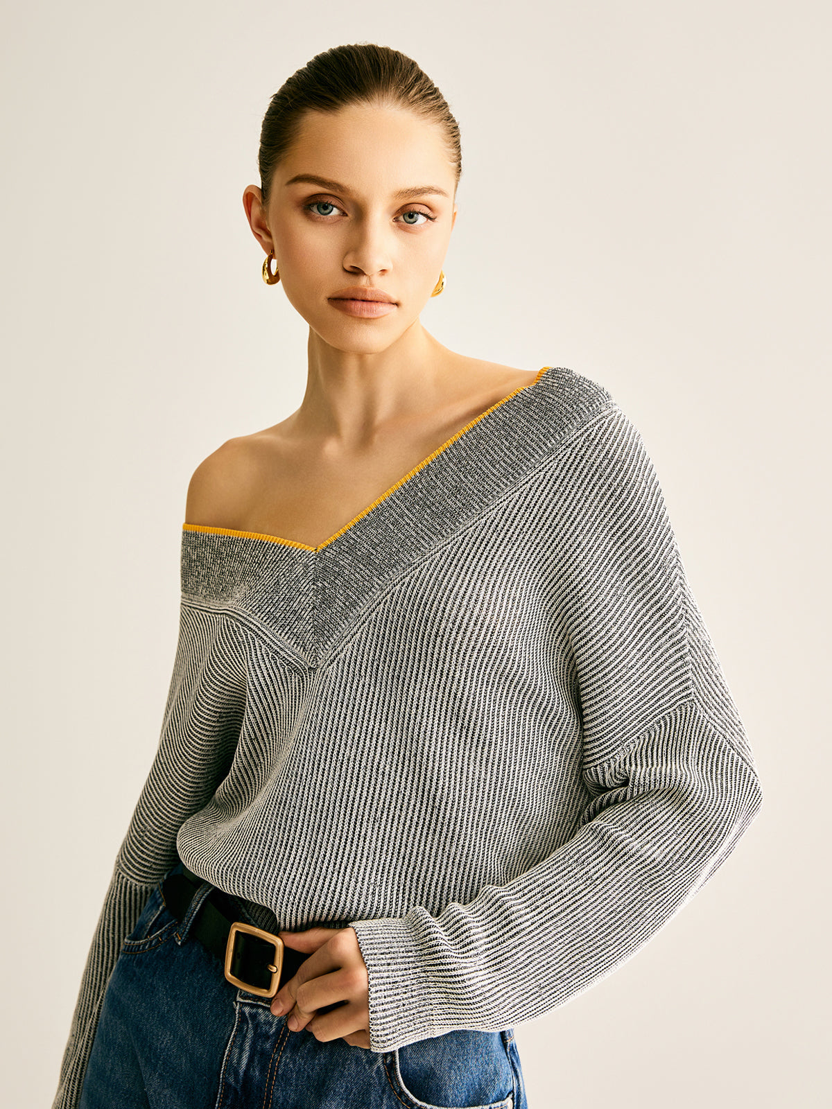 V Yaka İki Renkli Kaburga Örgü Üst