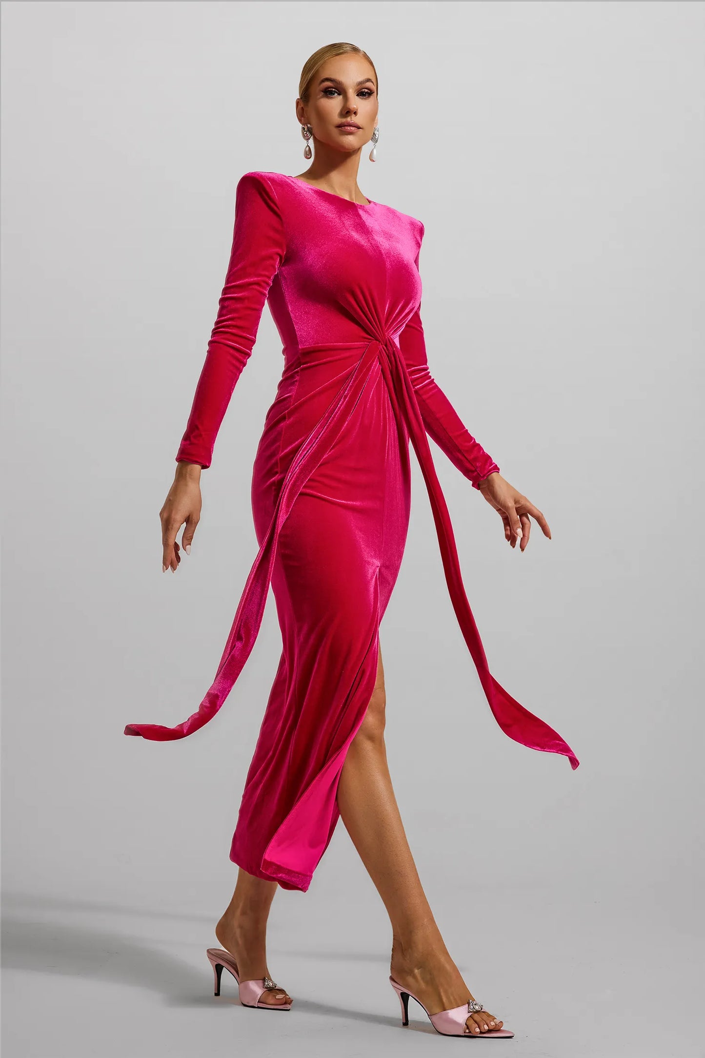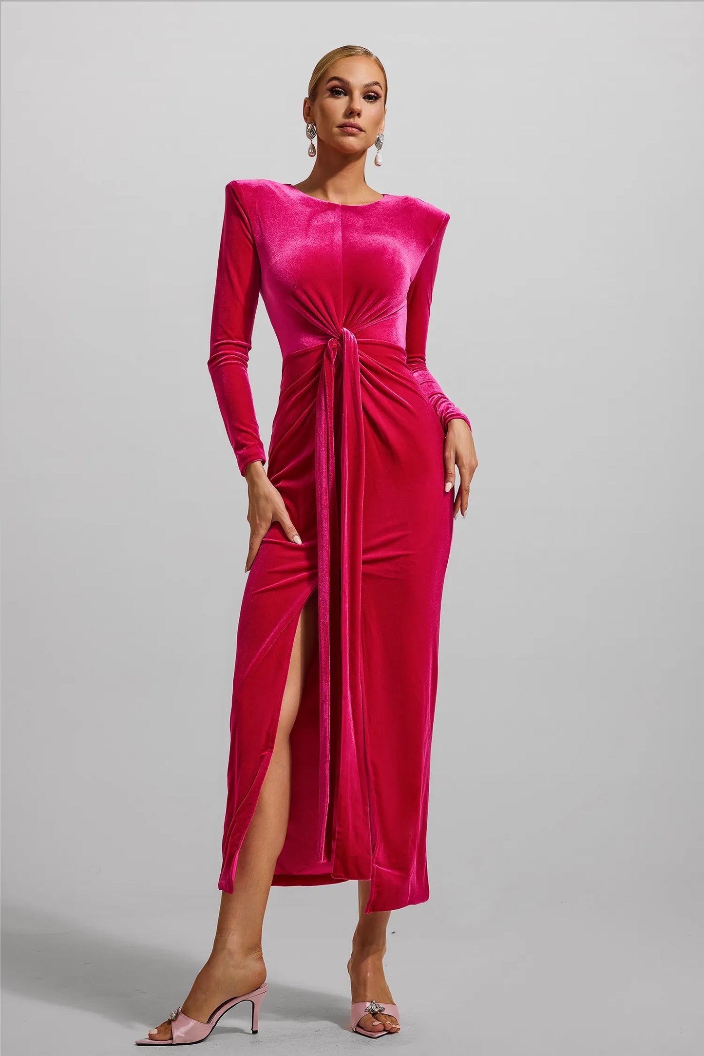 Kadife Düğümlü Uzun Kollu Maxi Elbise