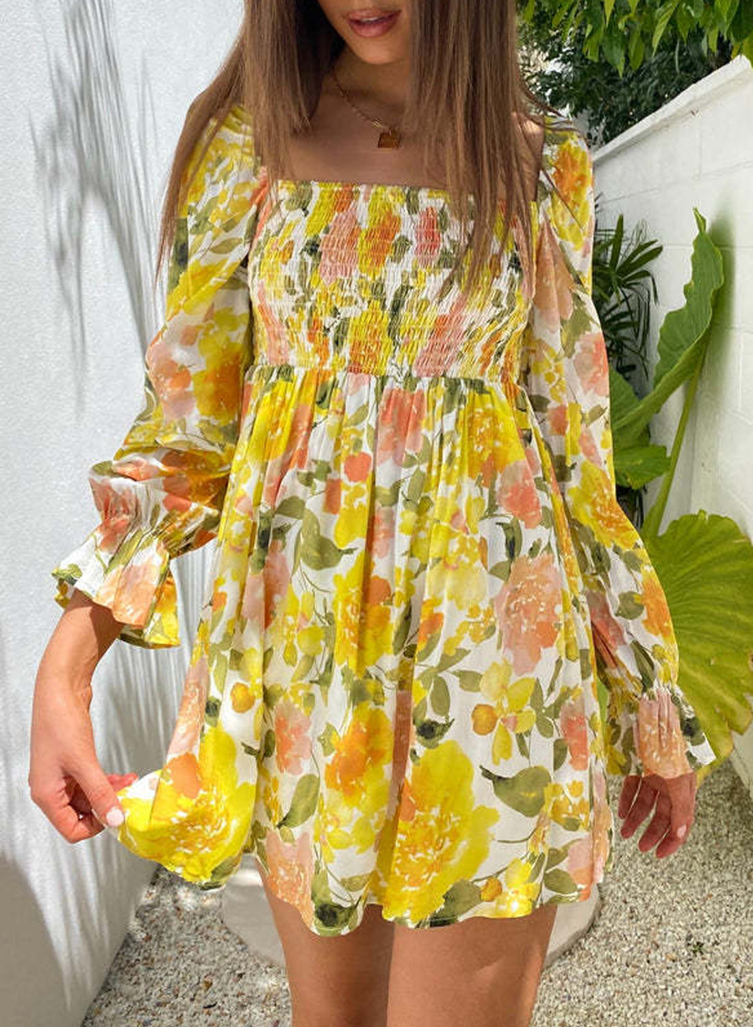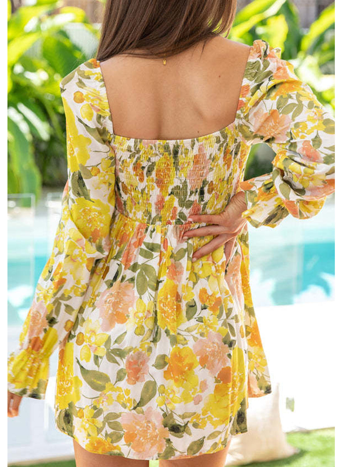 Sarı Çiçekli Uzun Kollu Mini Elbise