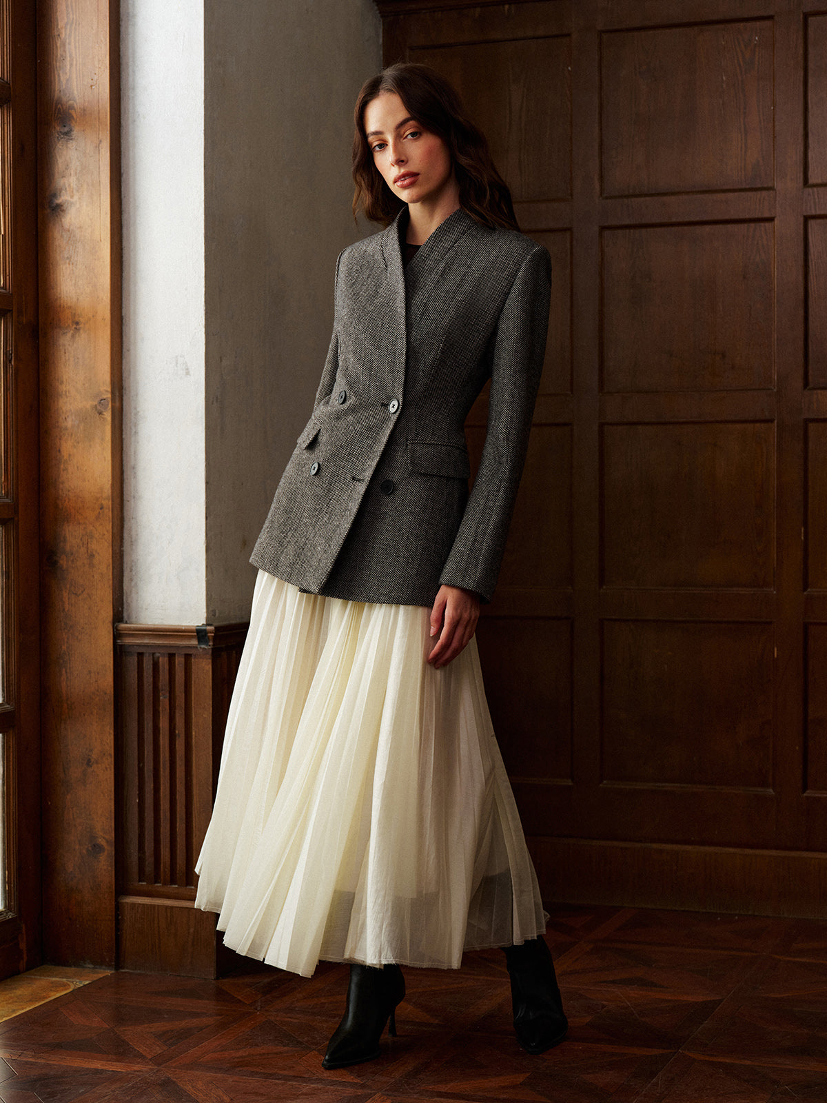 Glam Zarif Panelli Tül Uzun Kollu A Kesim Maxi Elbise