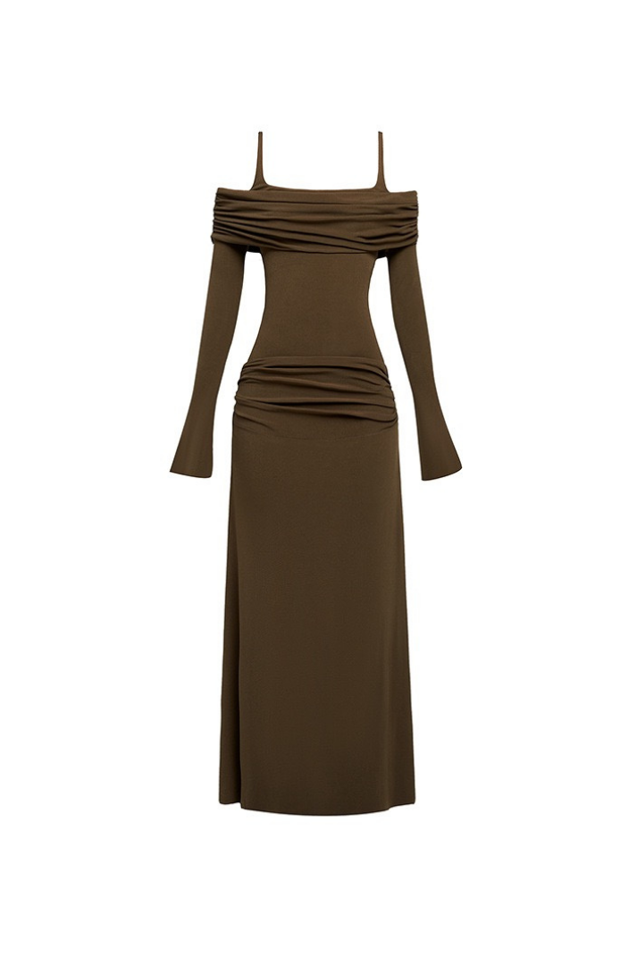 Zoey Drapeli Kahverengi Uzun Elbise, şık ve çok yönlü bir parça…