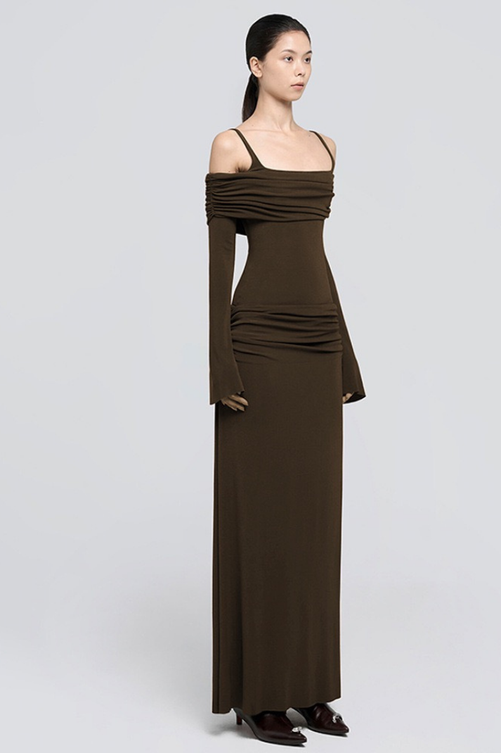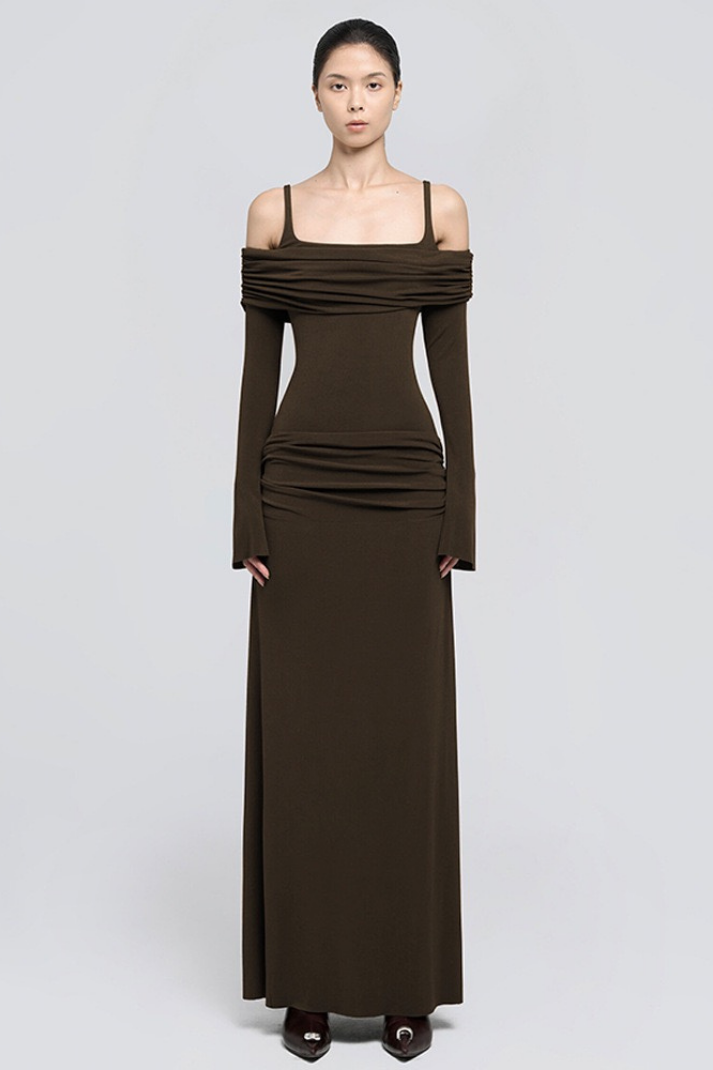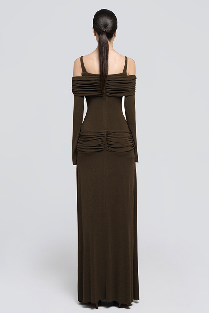 Zoey Drapeli Kahverengi Uzun Elbise